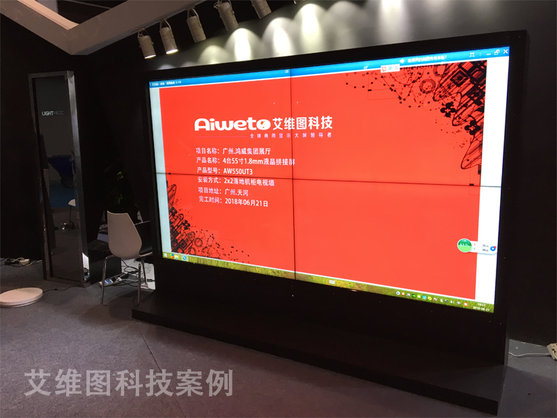 根據廣州鴻威會展集團的客戶需求, 本來按效果來說應該安裝液壓前維護支架式,但是由于需要做觸摸拼接屏,只能定制落地式機柜才能安裝,此套艾維圖科技提供的55寸超窄邊觸摸液晶拼接系統為廣州鴻威會展集團的所有工作人員促進了工作效率,從節能、顯示方式、超高的清晰度等眾多優勢,無一不彰顯出觸摸拼接屏的獨特魅力。