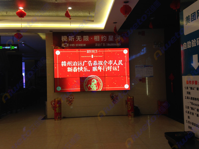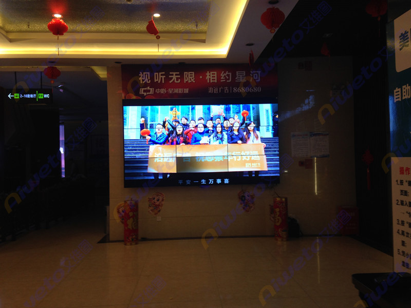 此次項目是為贛州星際國際影城大廳內(nèi)安裝全高清、無線大屏幕液晶拼接系統(tǒng),為其打造了一整套集傳媒、廣告于一體的現(xiàn)代化影城。