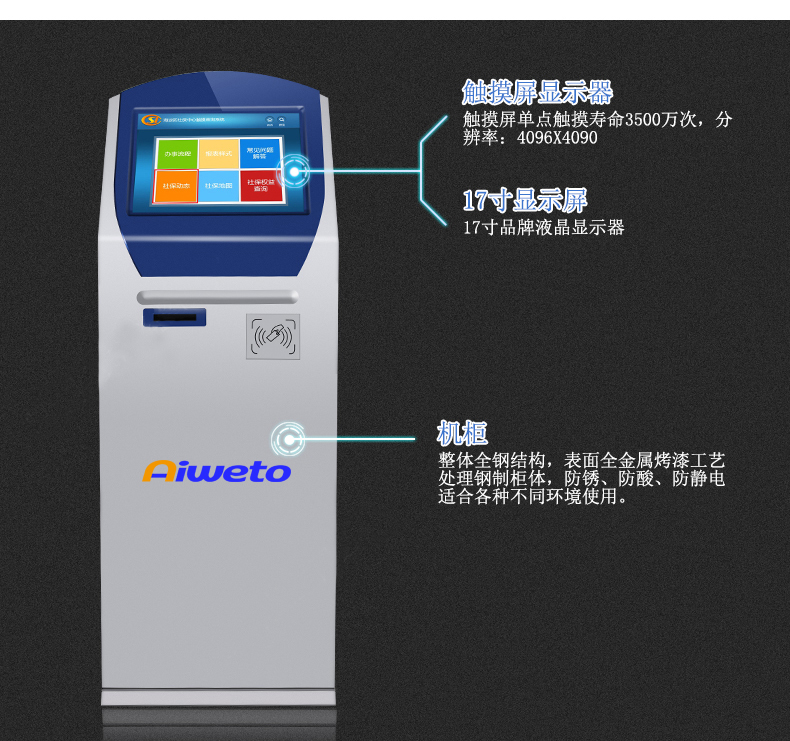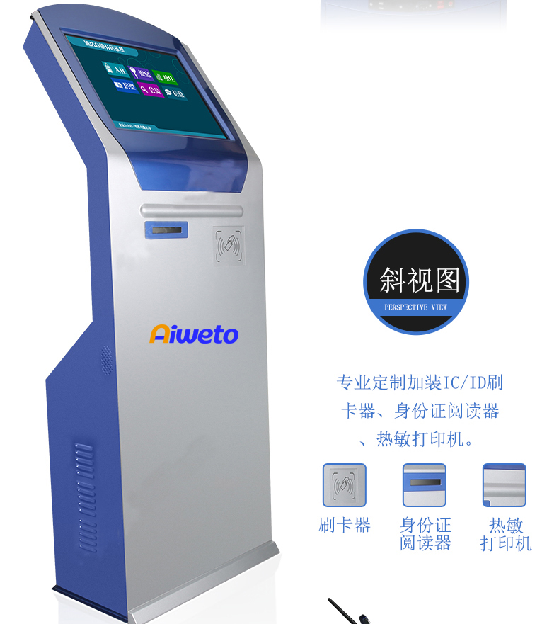 17”19”排隊叫號機,排隊取號系統軟硬件皆可定制,多種組件可選擇:附帶功能可調換,可智能讀取二代身份證支持紅外掃描,條形碼、LED顯示屏,鍵盤,更換色板等高端配置,極速體驗。