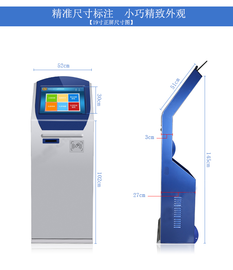 人體機學造型設計:人性化機型設計,符合人體站立姿態使用機器及視覺查看屏幕的最佳角度貼心細節設計,只為您使用更便捷。