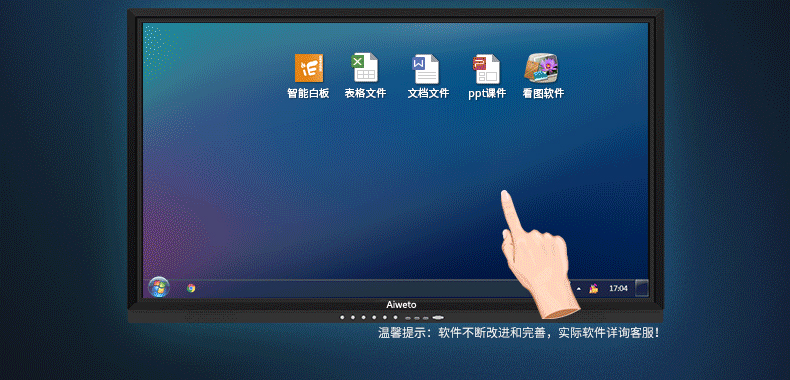 AW系列-多媒體教學一體機,高清大屏顯示,壁掛支架多種使用方式,人性化機型設計,立式與掛式兩種使用方法可交替使用,避免使用環(huán)境發(fā)生變化時產(chǎn)生的資源浪費問題采用LED背光源長壽命,低功耗,環(huán)保節(jié)能。智能電子白板,各種文件一鍵加載,多點觸控智能電子白板適用于各種商務會議,支持手寫批注,兼容日常office辦公軟件,本地、U盤、網(wǎng)盤、局域網(wǎng)數(shù)據(jù)輕松駕馭。書寫流暢,減少視覺誤差,高端企業(yè)必備,多重主題背景,筆形色彩,任意選擇。高端配置 讓運行速度,完美兼容WIN7,WIN8 隨意切換。