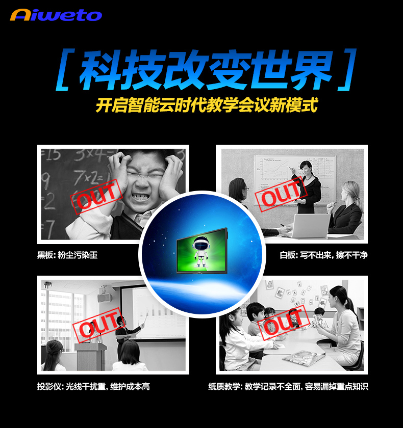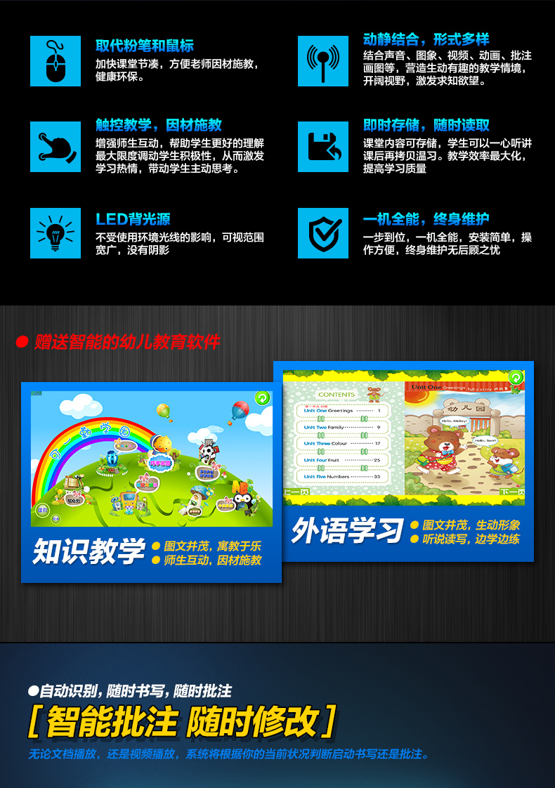 AW系列-多媒體教學一體機,高清大屏顯示,壁掛支架多種使用方式,人性化機型設計,立式與掛式兩種使用方法可交替使用,避免使用環境發生變化時產生的資源浪費問題采用LED背光源長壽命,低功耗,環保節能。智能電子白板,各種文件一鍵加載,多點觸控智能電子白板適用于各種商務會議,支持手寫批注,兼容日常office辦公軟件,本地、U盤、網盤、局域網數據輕松駕馭。書寫流暢,減少視覺誤差,高端企業必備,多重主題背景,筆形色彩,任意選擇。高端配置 讓運行速度,完美兼容WIN7,WIN8 隨意切換。