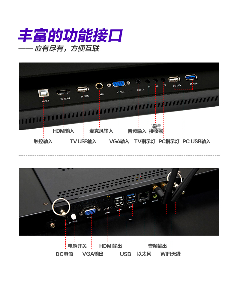 HDMI(外置)×2,HDMI(內置)×1,VGA×1,VGA Audio×1,AV×2,YPbPr×1,TV×1,USB2.0×2,USB3.0×1,外置觸摸屏USB2.0×1,SD卡×1,RJ45網口×1 |